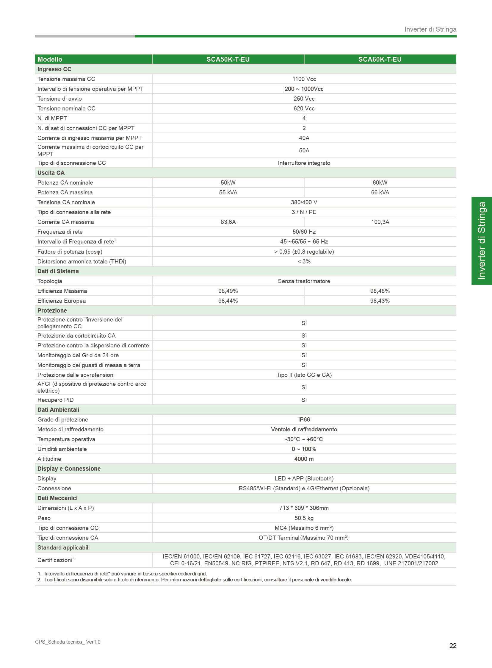 Inverter di Stringa Trifase 50/60 kW • 4 MPPT • 1100Vcc